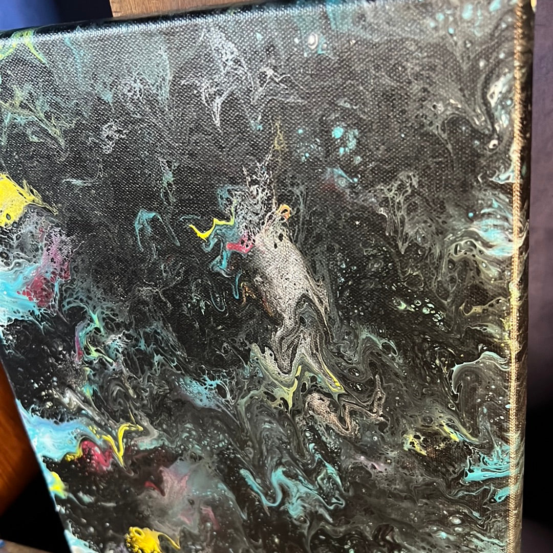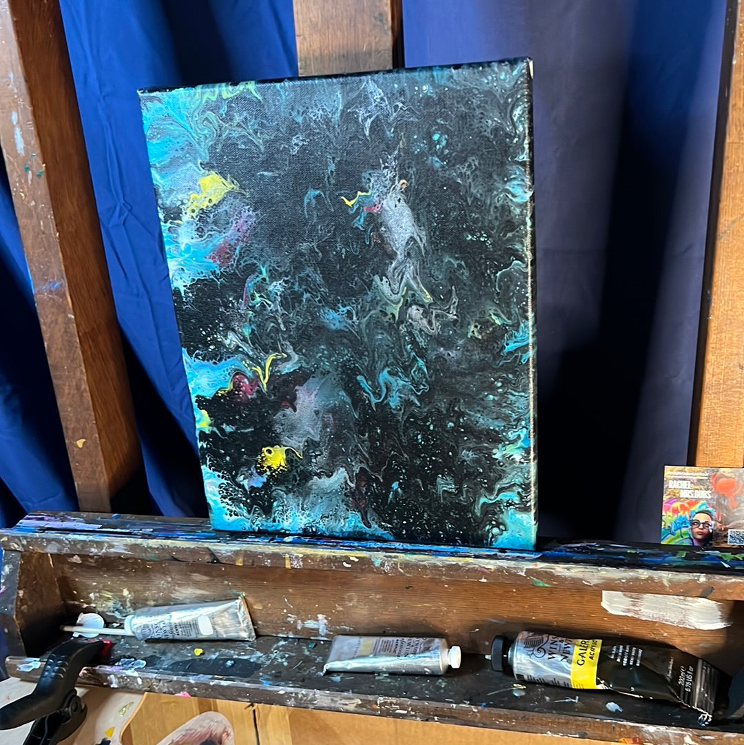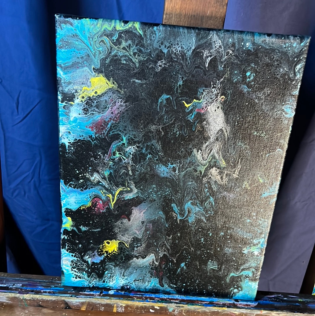 In the 11x14 acrylic pour titled "Cavernous Abyss," a mesmerizing journey unfolds as aquatic colors of the sea sink into the depths. The composition masterfully captures the transition from vibrant hues to profound darkness, evoking the mysterious allure of an abyss. The interplay of colors immerses the viewer in a captivating exploration of the unknown within the depths of this cavernous masterpiece.