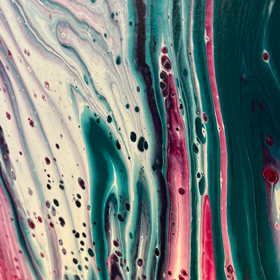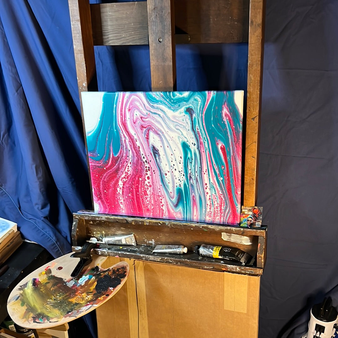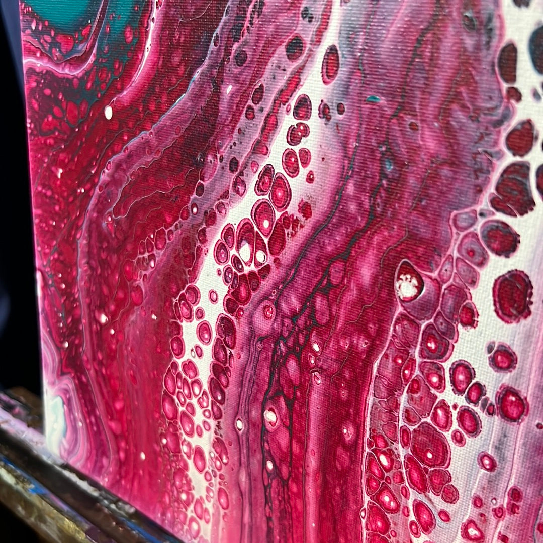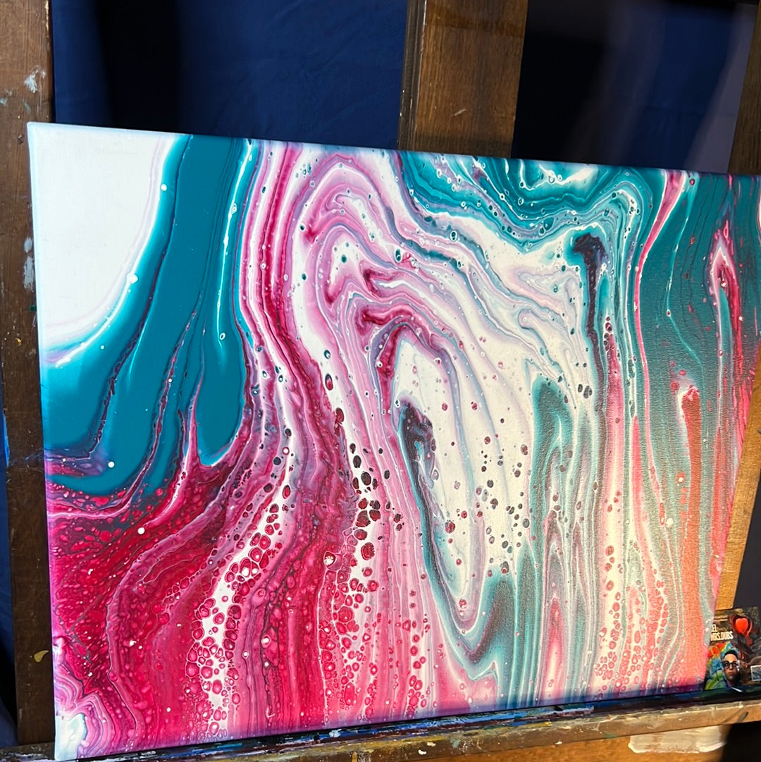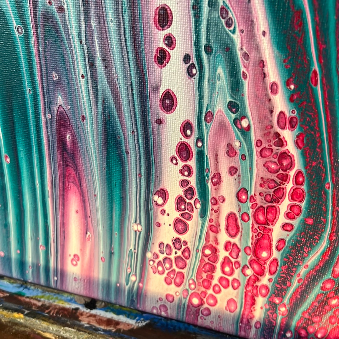 "Manifesting Powers," a dynamic 16x20 canvas, pulsates with change as the colors transition from white to pink to teal and back. Acidic cells burst forth, resembling little communities in revolution, adding an electrifying vibrancy that captures the essence of transformative energy and ever-evolving possibilities.