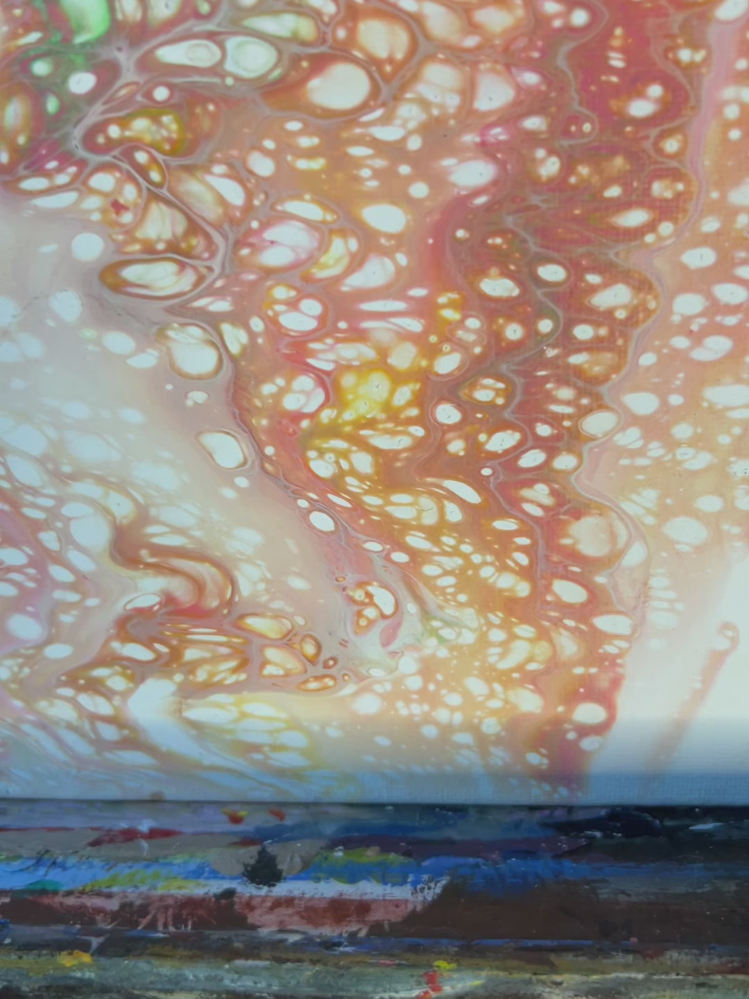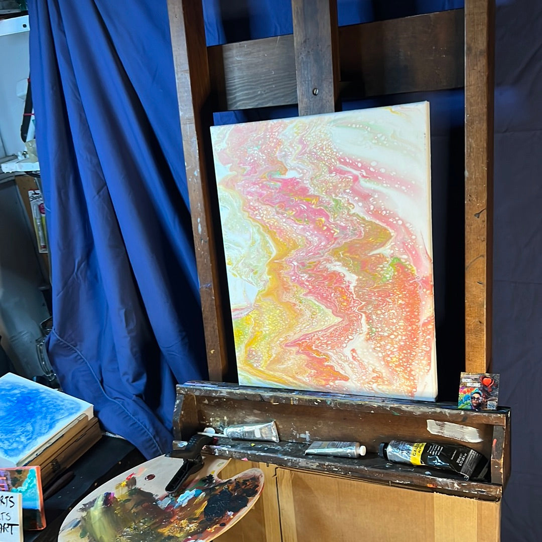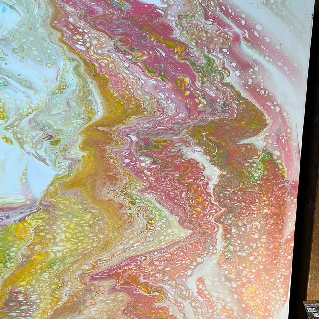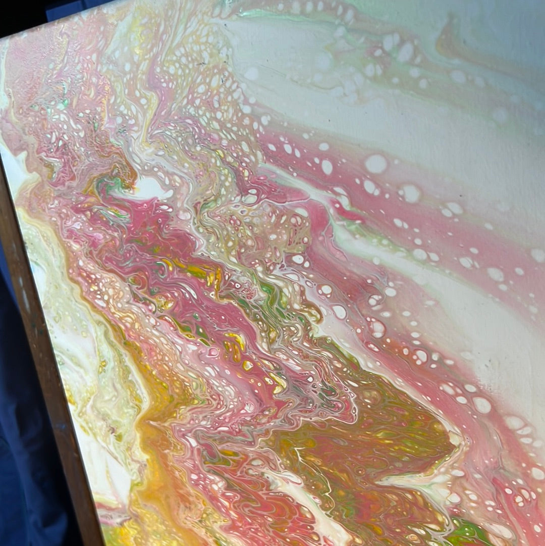 "Raspberry Sorbet," a lively 16x20 acidic spotted acrylic pour, captures the essence of a sorbet fight on a scorching summer day. The vibrant splashes and spots evoke the energy and playfulness of the moment, creating a visual treat that mirrors the refreshing chaos of a sweet and tangy sorbet showdown.