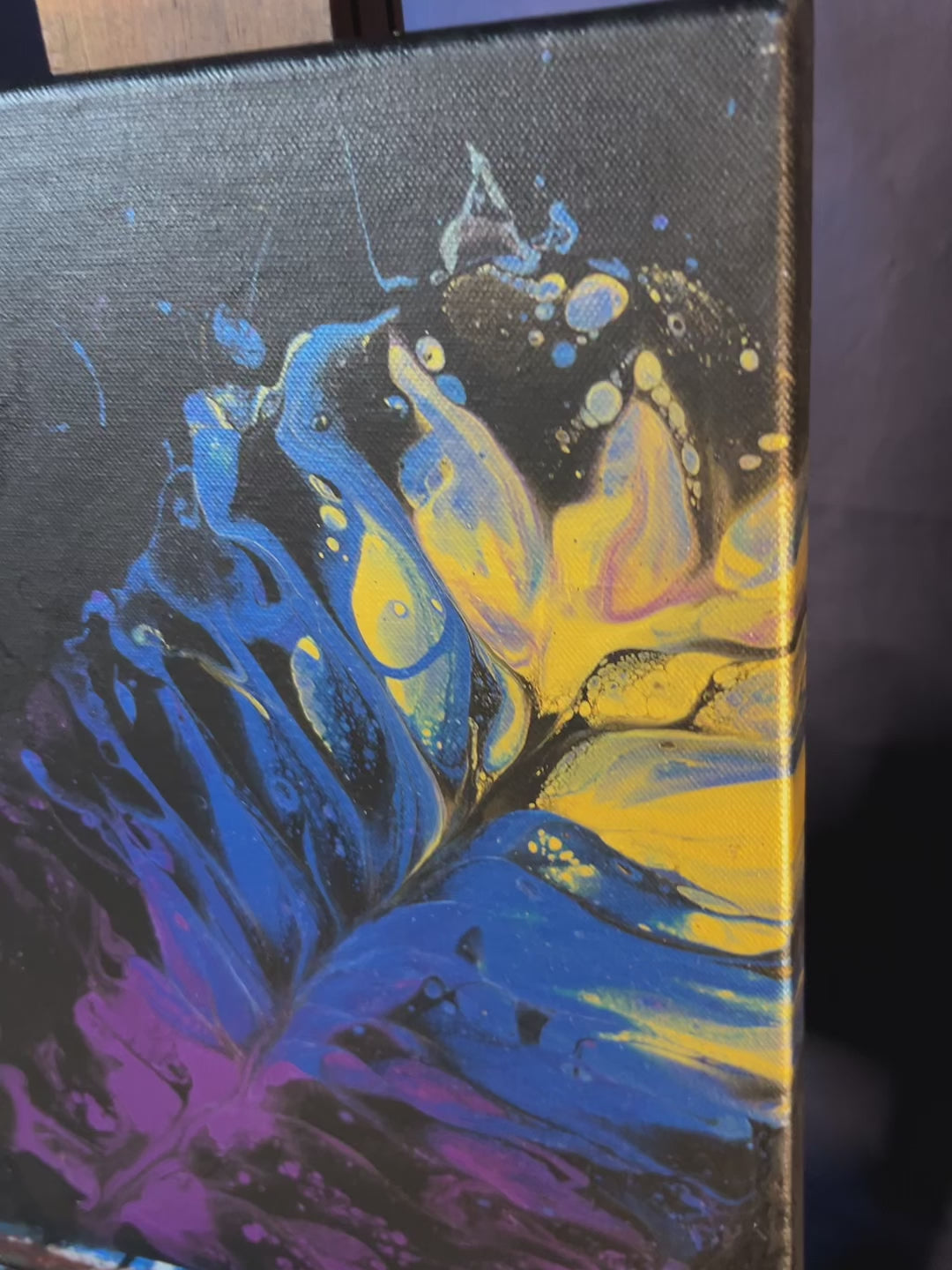The 11x14 metallic black canvas features a captivating feather pour with streams of amethyst, metallic blue, and gold. Against the deep backdrop, these rich metallic hues create a mesmerizing contrast, infusing the piece with an elegant and dynamic allure, as if capturing the essence of a celestial feather dancing in the cosmos.