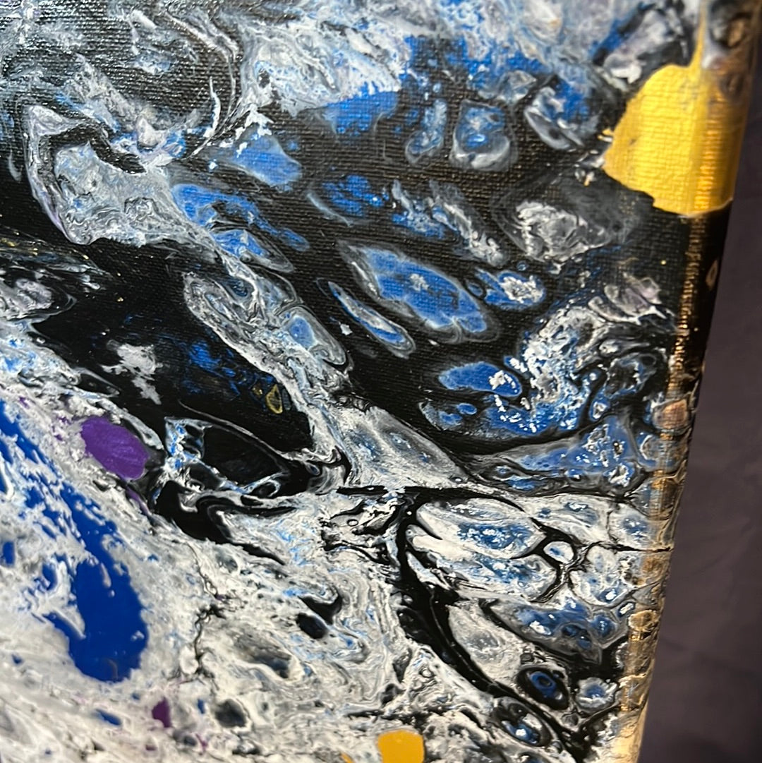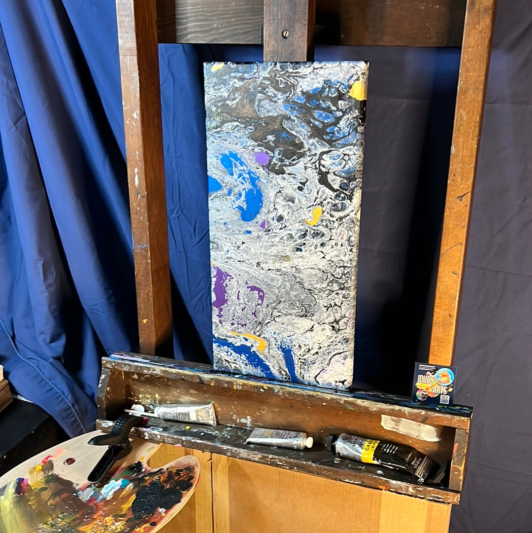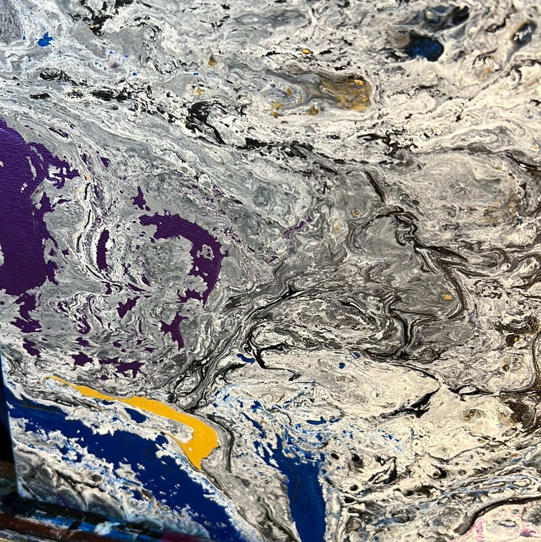 "Robotic Vaporization," a 10x20 acrylic pour, intricately mottles with cells, showcasing a captivating fusion of amethyst, metallic cobalt, and gold. This futuristic blend creates a visually stunning representation, evoking a sense of technological mystique and robotic sophistication in its dynamic amalgamation of colors and textures.
