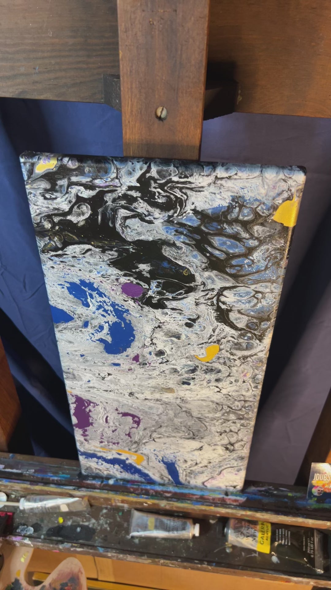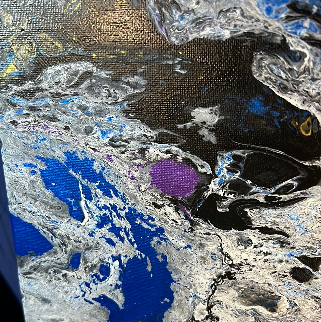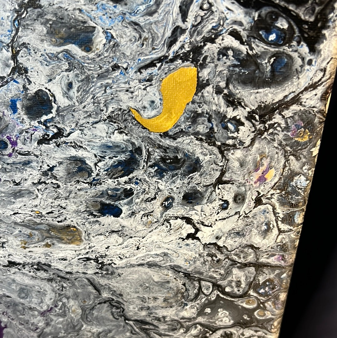 "Robotic Vaporization," a 10x20 acrylic pour, intricately mottles with cells, showcasing a captivating fusion of amethyst, metallic cobalt, and gold. This futuristic blend creates a visually stunning representation, evoking a sense of technological mystique and robotic sophistication in its dynamic amalgamation of colors and textures.