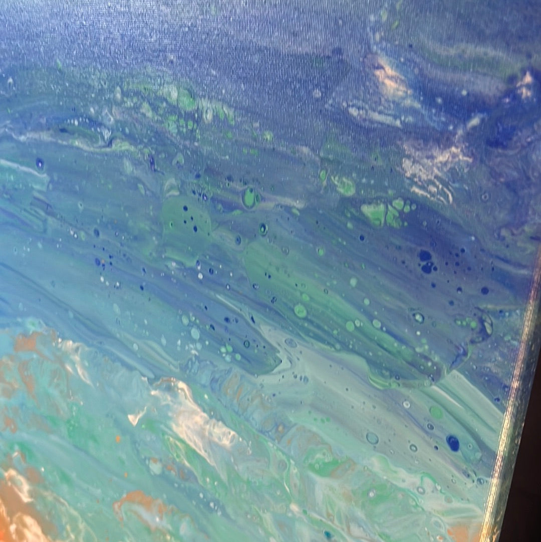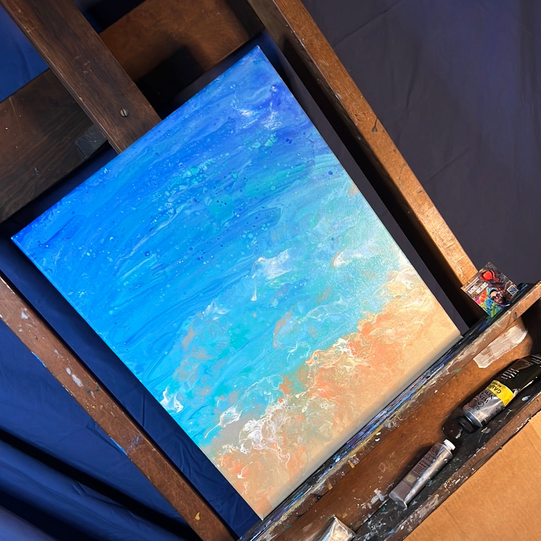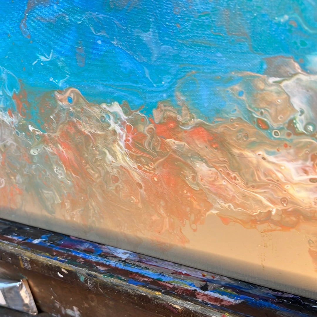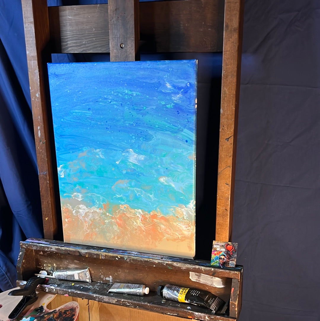 "Dive into the allure of 'Splash Zone,' a seductive 16x20 acrylic pour that mimics the sensual grace of a beach wave meeting the sandy shore. The captivating dance of azure blues and frothy whites invites you to immerse yourself in the pure essence of coastal elegance. This piece brings the sultry rhythm of the ocean to your space, a timeless celebration of nature's beauty that captivates and seduces with every glance."